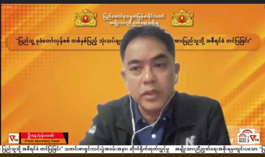 ပြီးခဲ့တဲ့ အောက်တိုဘာ ၇ ရက်နေ့ ညက “ပြည်သူ့ခုခံတော်လှန်စစ် တစ်နှစ်ပြည့် သုံးသပ်ချက်နှင့် ရှေ့လုပ်ငန်းစဉ်များအား ပြည်သူသို့ အစီရင်ခံတင်ပြခြင်း” ခေါင်းစဉ်နဲ့ ပြုလုပ်တဲ့ သတင်းစာရှင်းလင်းပွဲမှာ NUG ရဲ့ ပြောရေးဆိုခွင့်ရှိသူ ဦးနေဘုန်းလတ်က ပြောဆိုခဲ့တာပါ။