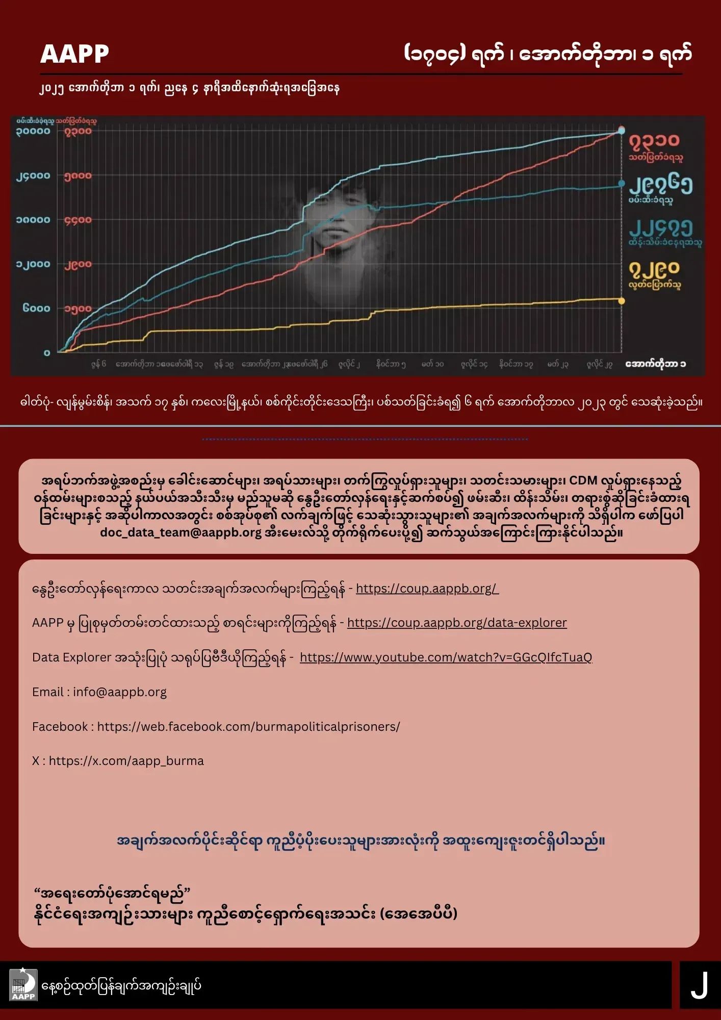 AAPP ရဲ့ အောက်တိုဘာ ၁ရက်နေ့အထိ ထုတ်ပြန်ချက်အရ မြန်မာနိုင်ငံတဝှမ်းလုံးမှာ စစ်အာဏာသိမ်းမှုကာလ (၁၇၀၄) ရက်အတွင်း ပြည်သူ (၇၃၁၀) ဦးအထိ အကြမ်းဖက်သတ်ဖြတ်ခံခဲ့ရကြောင်း သိရပါတယ်။