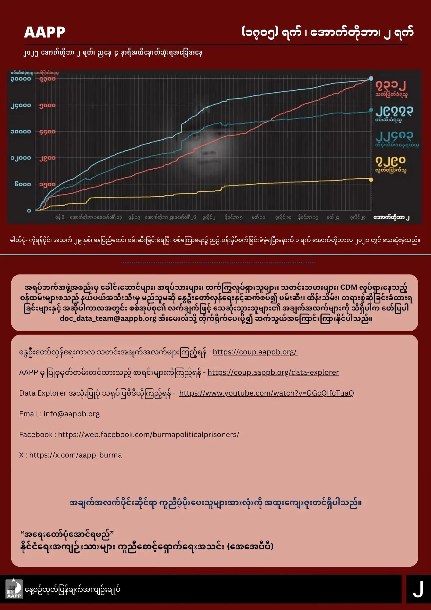AAPP ရဲ့ အောက်တိုဘာ ၂ရက်နေ့အထိ ထုတ်ပြန်ချက်အရ မြန်မာနိုင်ငံတဝှမ်းလုံးမှာ စစ်အာဏာသိမ်းမှုကာလ (၁၇၀၅) ရက်အတွင်း ပြည်သူ (၇၃၁၂) ဦးအထိ အကြမ်းဖက်သတ်ဖြတ်ခံခဲ့ရကြောင်း သိရပါတယ်။