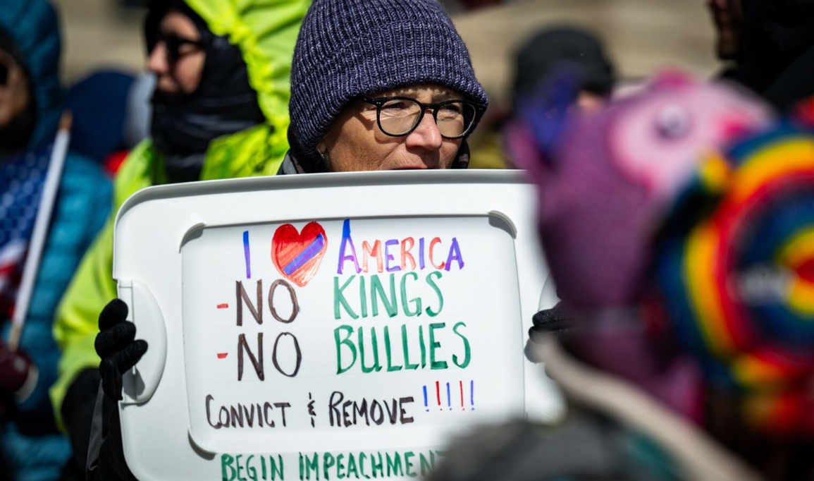 နယူးယောက်စီးတီးရဲ့ အထင်ကရ တိုင်းမ်စကွဲလမ်းဆုံမှာ လူထောင်ပေါင်းများစွာက “ဒီမိုကရေစီဆိုတာ ဘုရင်စနစ် မဟုတ်” ၊ “ဖွဲ့စည်းပုံကို စိတ်ကြိုက်အသုံးချလို့ မရ” ဆိုတဲ့ ကြွေးကြော်သံတွေ အော်ဟစ်ပြီး လူထောင်ချီ ဆန္ဒပြခဲ့ကြပါတယ်။