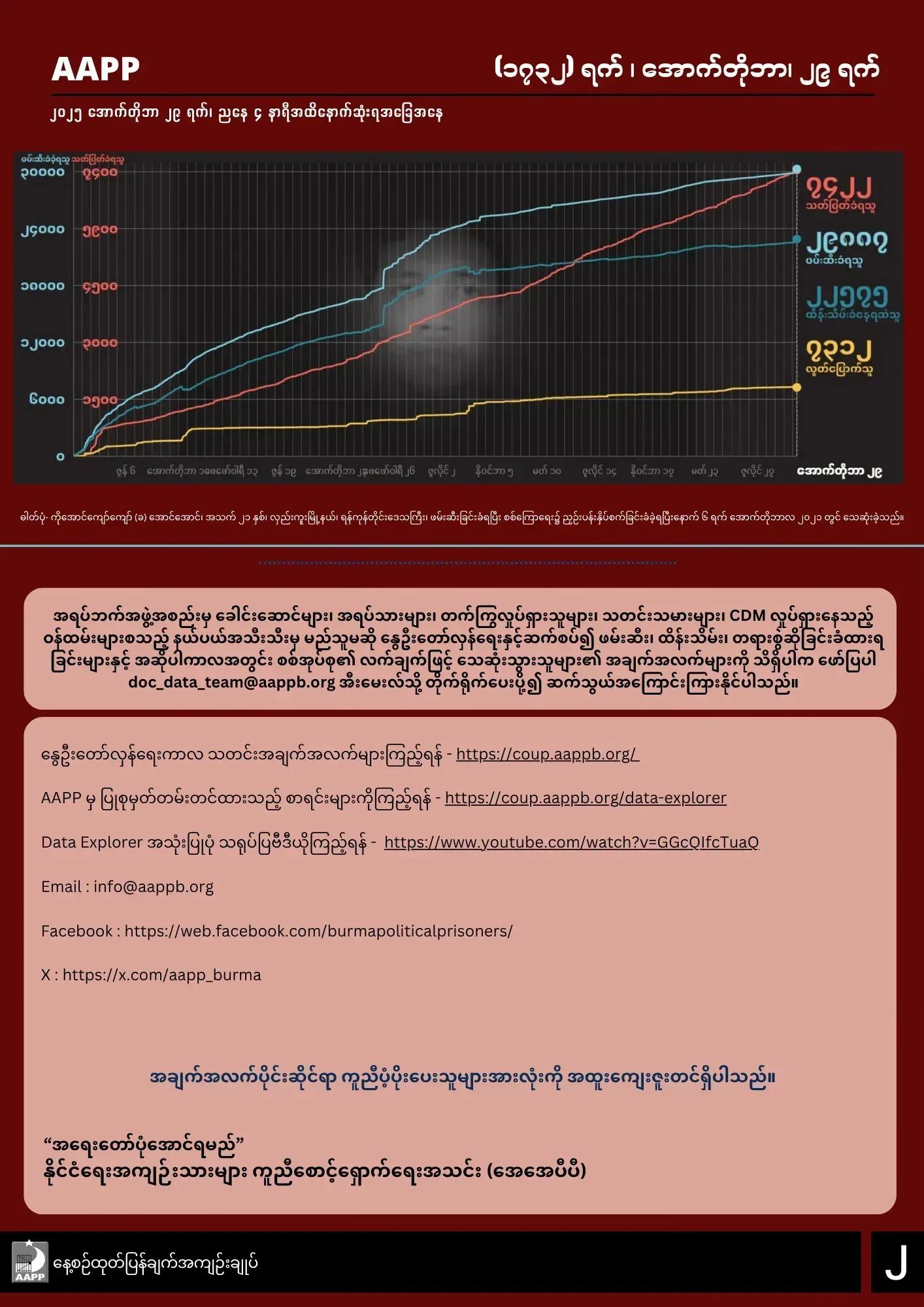 AAPP ရဲ့ အောက်တိုဘာ၂၉ရက်နေ့အထိ ထုတ်ပြန်ချက်အရ မြန်မာနိုင်ငံတဝှမ်းလုံးမှာ စစ်အာဏာသိမ်းမှုကာလ (၁၇၃၂) ရက်အတွင်း ပြည်သူ (၇၄၂၂) ဦးအထိ အကြမ်းဖက်သတ်ဖြတ်ခံခဲ့ရကြောင်း သိရပါတယ်။