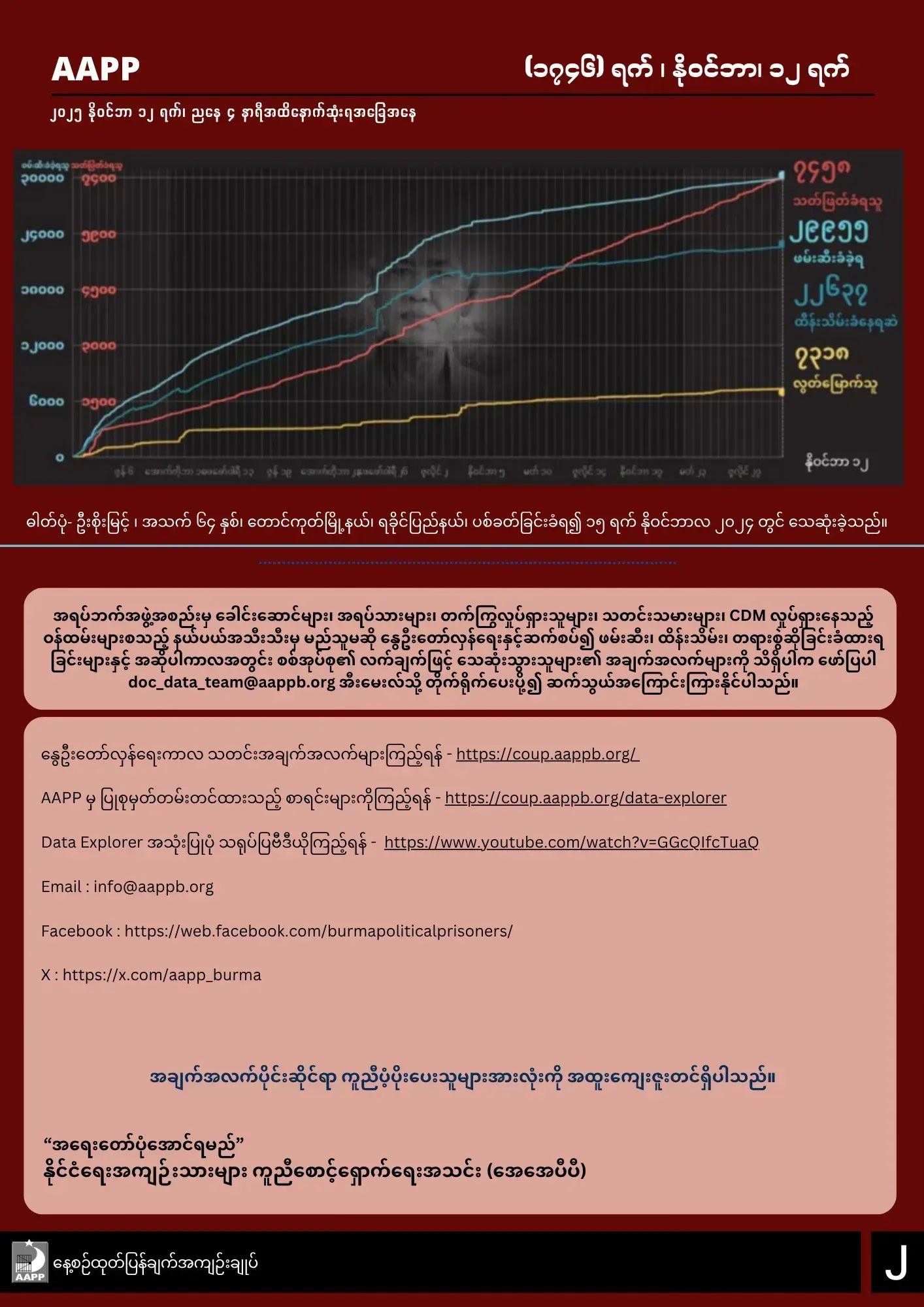 AAPP ရဲ့ နိုဝင်ဘာ ၁၂ရက်နေ့အထိ ထုတ်ပြန်ချက်အရ မြန်မာနိုင်ငံတဝှမ်းလုံးမှာ စစ်အာဏာသိမ်းမှုကာလ (၁၇၄၆) ရက်အတွင်း ပြည်သူ (၇၄၅၈) ဦးအထိ အကြမ်းဖက်သတ်ဖြတ်ခံခဲ့ရကြောင်း သိရပါတယ်။