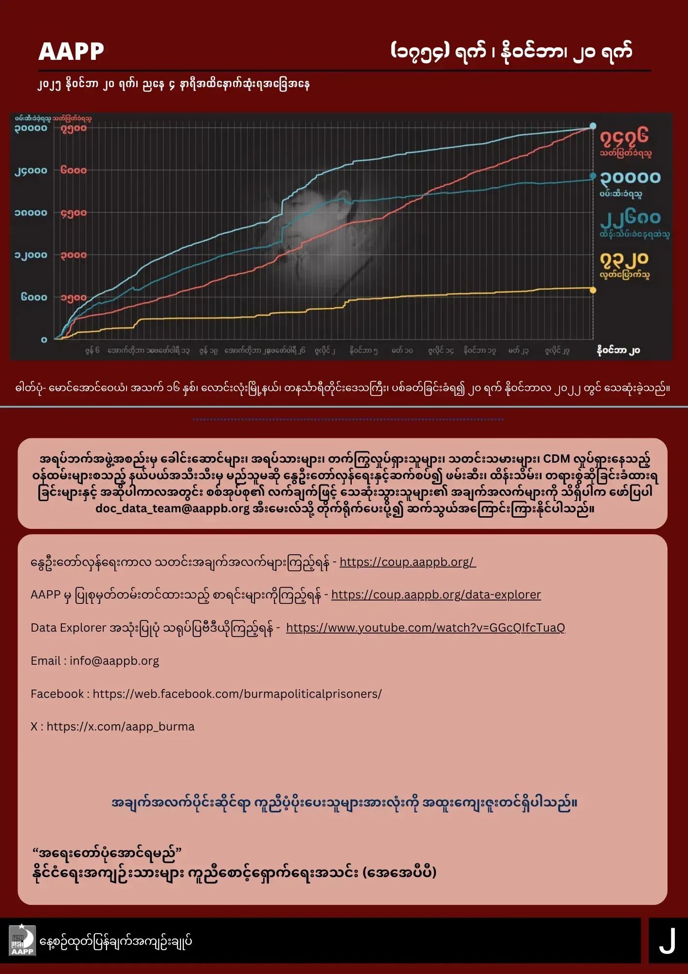 AAPP ရဲ့ နိုဝင်ဘာ ၂၀ရက်နေ့အထိ ထုတ်ပြန်ချက်အရ မြန်မာနိုင်ငံတဝှမ်းလုံးမှာ စစ်အာဏာသိမ်းမှုကာလ (၁၇၅၄) ရက်အတွင်း ပြည်သူ (၇၄၇၆) ဦးအထိ အကြမ်းဖက်သတ်ဖြတ်ခံခဲ့ရကြောင်း သိရပါတယ်။