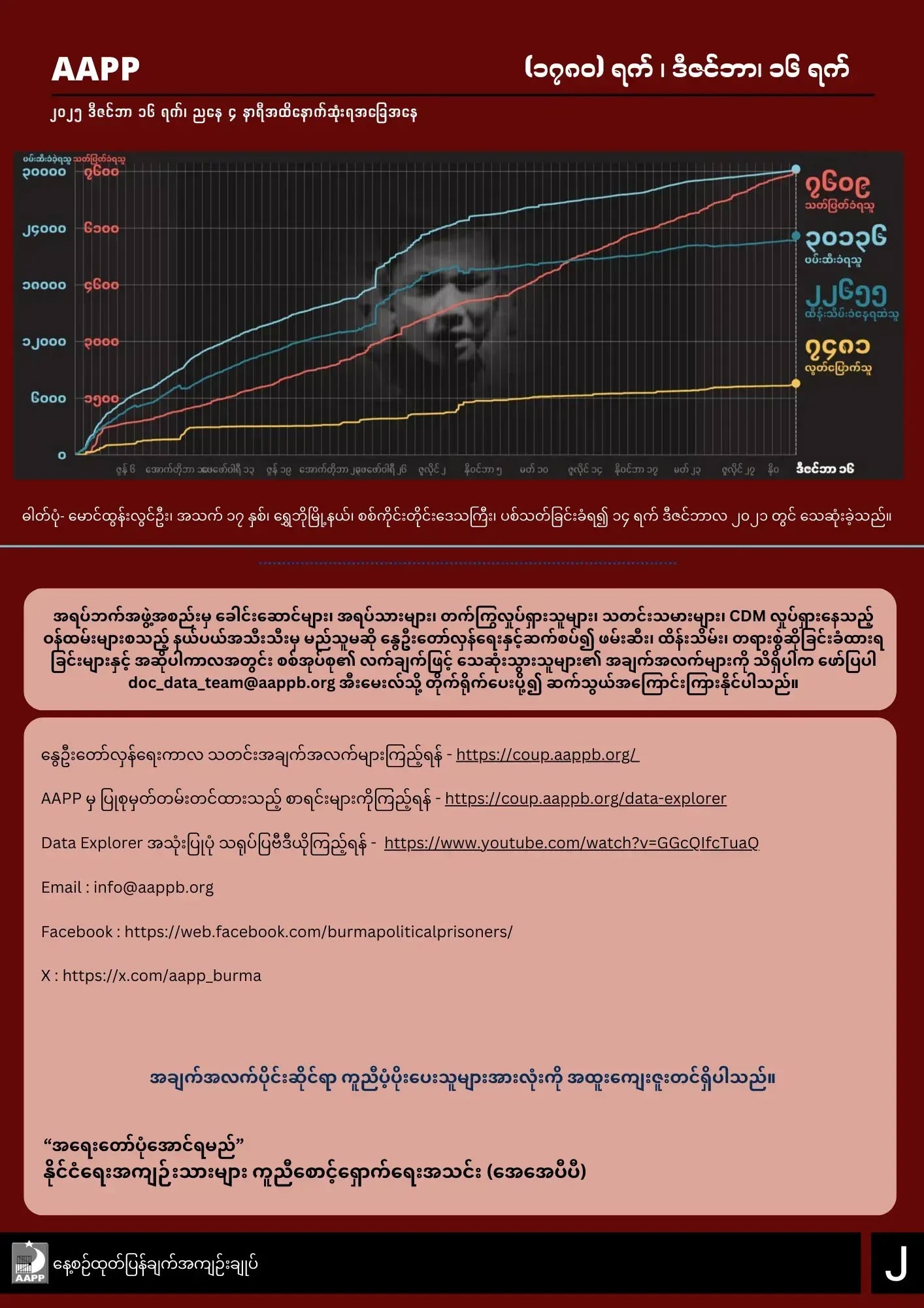 AAPP ရဲ့ ဒီဇင်ဘာ၁၆ရက်နေ့အထိ ထုတ်ပြန်ချက်အရ မြန်မာနိုင်ငံတဝှမ်းလုံးမှာ စစ်အာဏာသိမ်းမှုကာလ (၁၇၈၀) ရက်အတွင်း ပြည်သူ (၇၆၀၉) ဦးအထိ အကြမ်းဖက်သတ်ဖြတ်ခံခဲ့ရကြောင်း သိရပါတယ်။