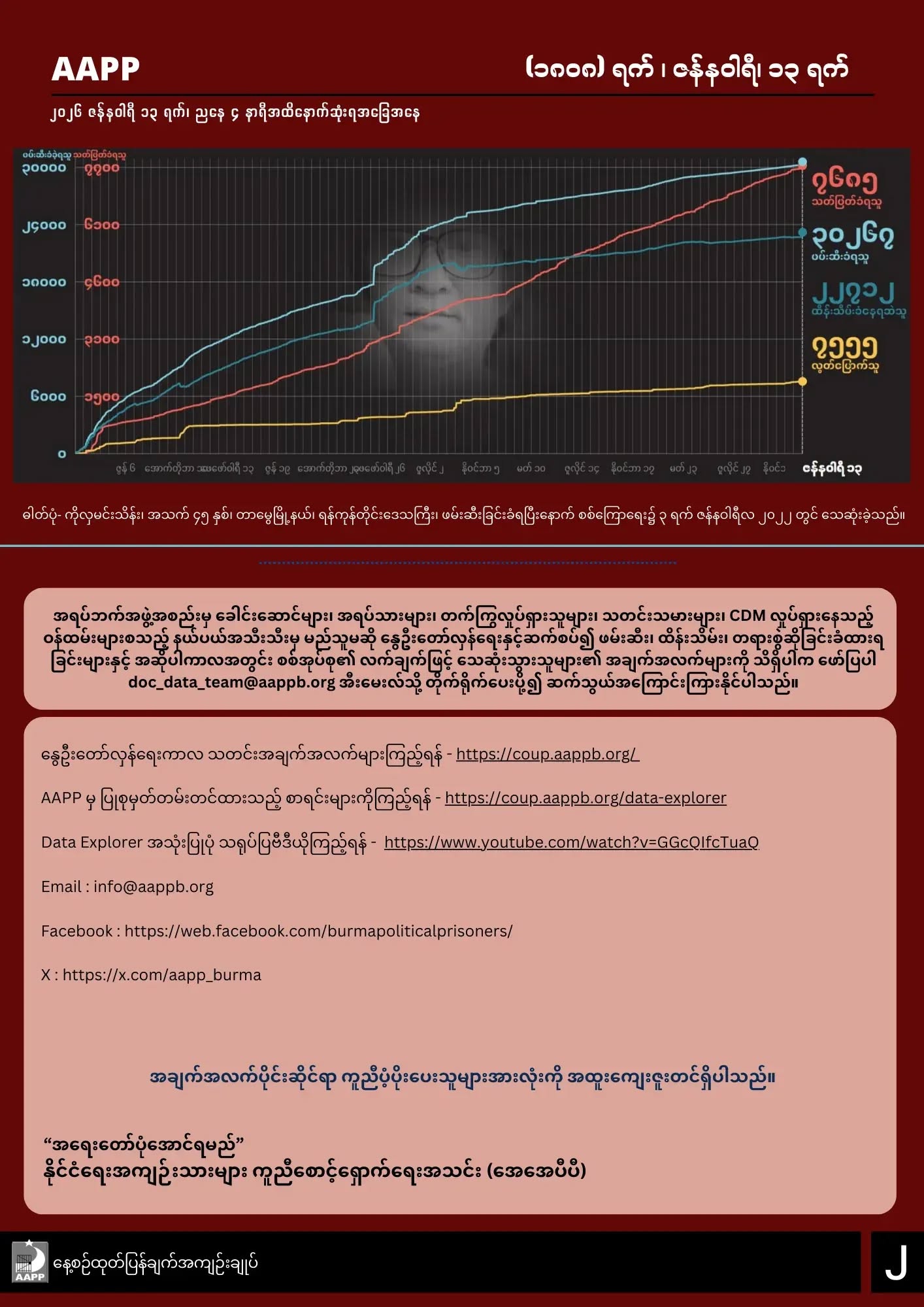 AAPP ရဲ့ ဇန်နဝါရီ၁၃ ရက်နေ့အထိ ထုတ်ပြန်ချက်အရ မြန်မာနိုင်ငံတဝှမ်းလုံးမှာ စစ်အာဏာသိမ်းမှုကာလ (၁၈၀၈) ရက်အတွင်း ပြည်သူ (၇၆၈၅) ဦးအထိ အကြမ်းဖက်သတ်ဖြတ်ခံခဲ့ရကြောင်း သိရပါတယ်။