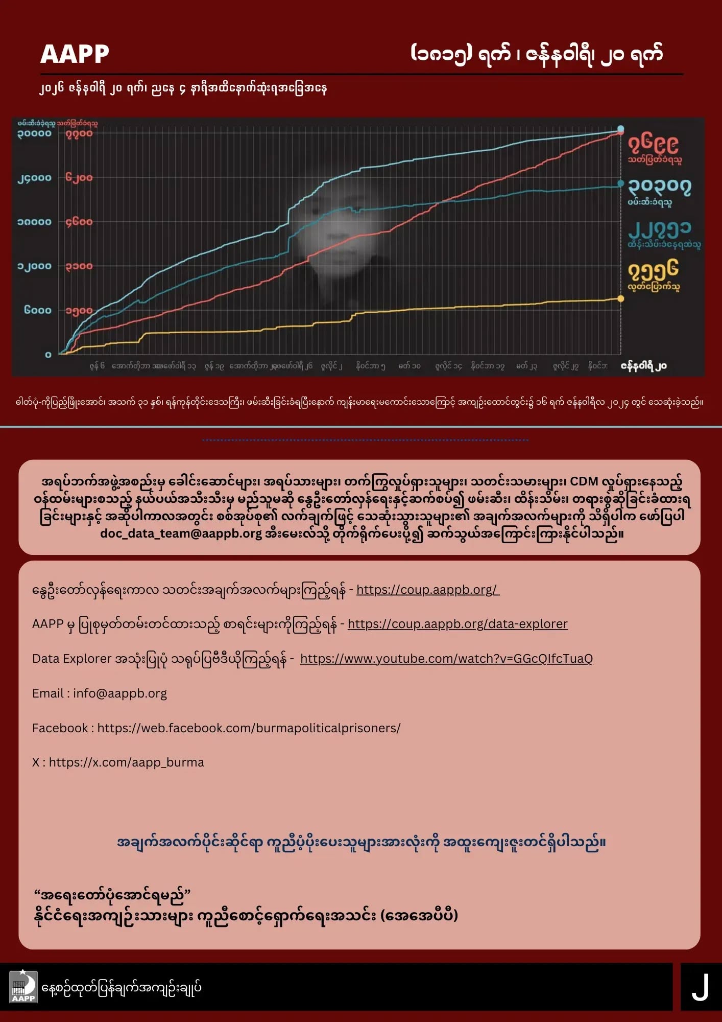 AAPP ရဲ့ ဇန်နဝါရီ၂၀ရက်နေ့အထိ ထုတ်ပြန်ချက်အရ မြန်မာနိုင်ငံတဝှမ်းလုံးမှာ စစ်အာဏာသိမ်းမှုကာလ (၁၈၁၅) ရက်အတွင်း ပြည်သူ (၇၆၉၉) ဦးအထိ အကြမ်းဖက်သတ်ဖြတ်ခံခဲ့ရကြောင်း သိရပါတယ်။