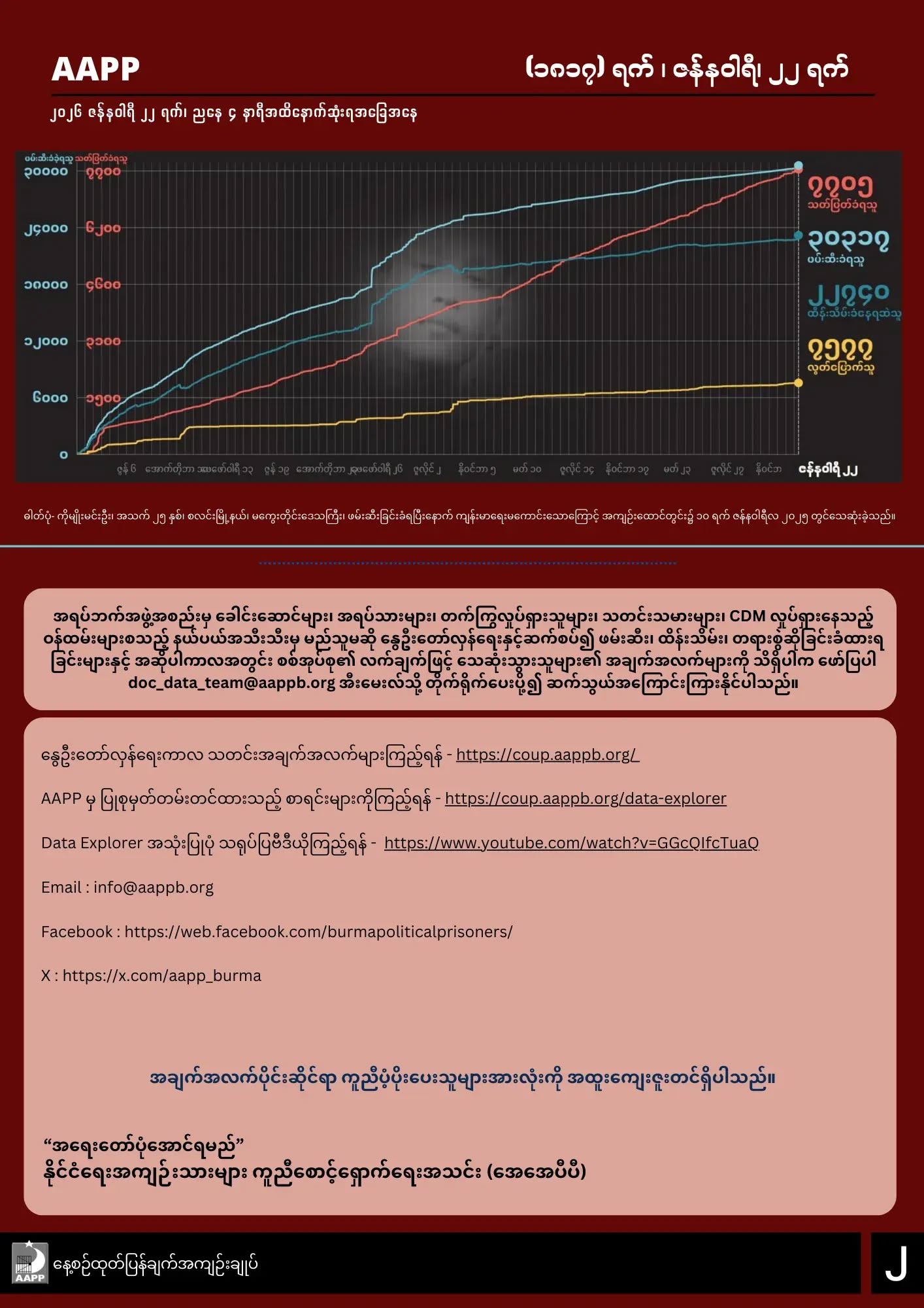 AAPP ရဲ့ ဇန်နဝါရီ၂၂ရက်နေ့အထိ ထုတ်ပြန်ချက်အရ မြန်မာနိုင်ငံတဝှမ်းလုံးမှာ စစ်အာဏာသိမ်းမှုကာလ (၁၈၁၇) ရက်အတွင်း ပြည်သူ (၇၇၀၅) ဦးအထိ အကြမ်းဖက်သတ်ဖြတ်ခံခဲ့ရကြောင်း သိရပါတယ်။