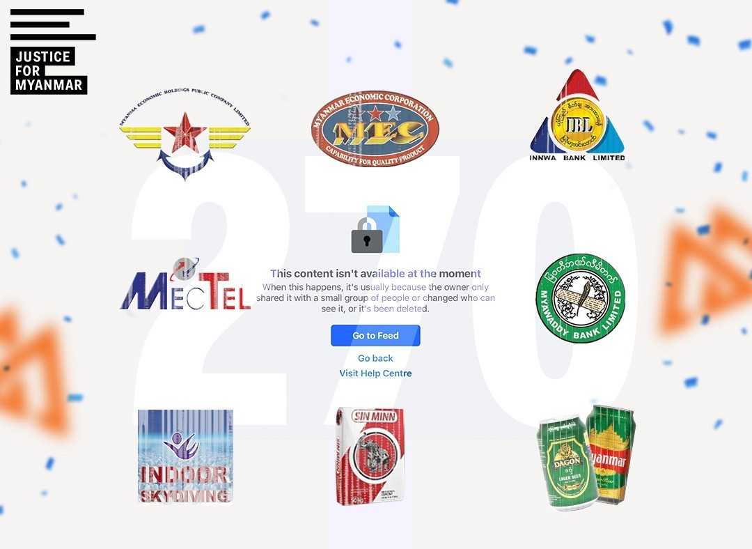 အာဏာသိမ်း စစ်အုပ်စုရဲ့ စီးပွားရေးနဲ့ ဝါဒဖြန့်ချိရေး အကောင့်ပေါင်း ၂၇၀ နီးပါးဟာ Facebook ကနေ ဖယ်ရှားခံလိုက်ရတယ်လို့ မြန်မာစစ်တပ်ရဲ့ လုပ်ဆောင်ချက်တွေကို စောင့်ကြည့်နေတဲ့ Justice For Myanmar JFM က ထုတ်ပြန်ထားပါတယ်။