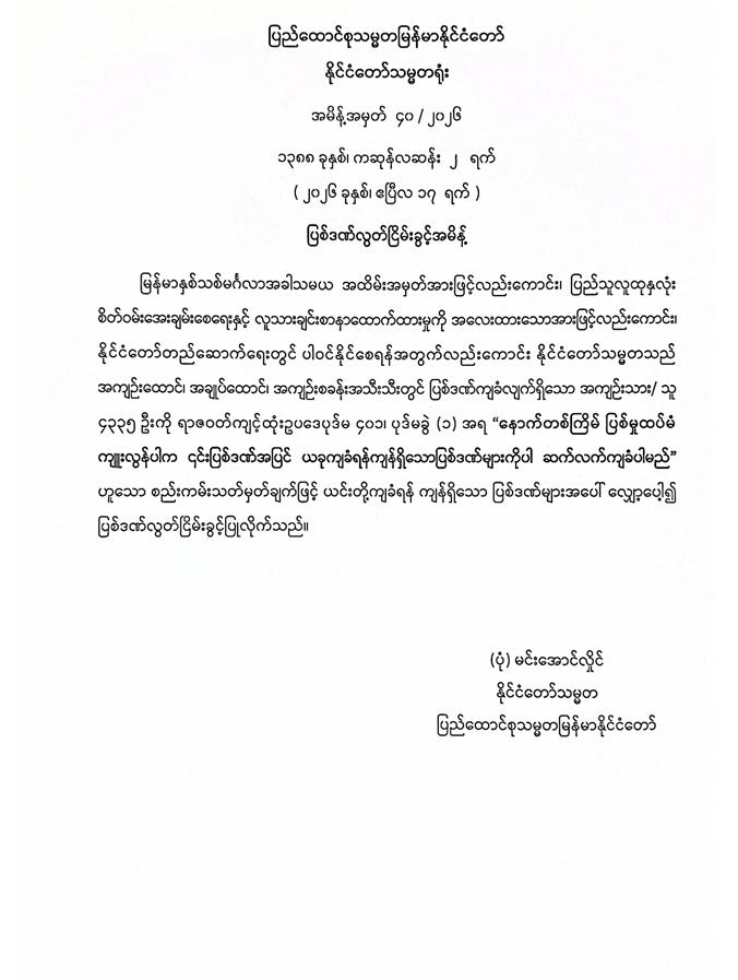 နိုင်ငံတဝန်းရှိ အကျဉ်းထောင်၊ အချုပ်ထောင်နဲ့အကျဉ်းစခန်းအသီးသီးမှာ ပြစ်ဒဏ်ကျခံနေရတဲ့ အကျဉ်းသား ၄၃၃၅ ဦးကို လွတ်ငြိမ်းချမ်းသာခွင့် ပေးအပ်ခဲ့တယ်လို့ အာဏာသိမ်း သမ္မတ ဦးမင်းအောင်လှိုင်က လက်မှတ်ထိုးပြီး ထုတ်ပြန်ပါတယ်။