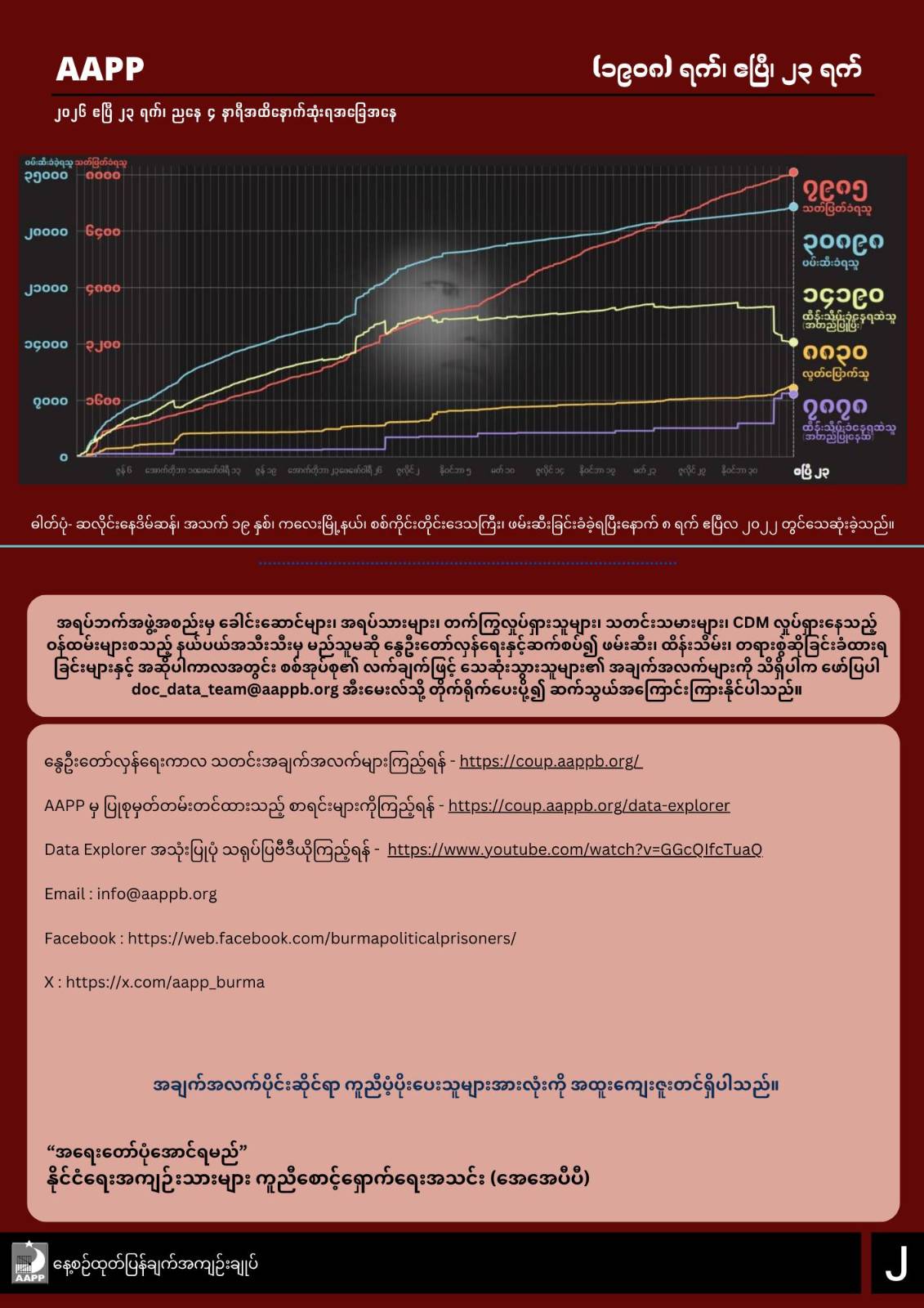 AAPP ရဲ့ ဧပြီ၂၃ရက်နေ့အထိ ထုတ်ပြန်ချက်အရ မြန်မာနိုင်ငံတဝှမ်းလုံးမှာ စစ်အာဏာသိမ်းမှုကာလ (၁၉၀၈) ရက်အတွင်း ပြည်သူ (၇၉၈၅) ဦးအထိ အကြမ်းဖက်သတ်ဖြတ်ခံခဲ့ရကြောင်း သိရပါတယ်။